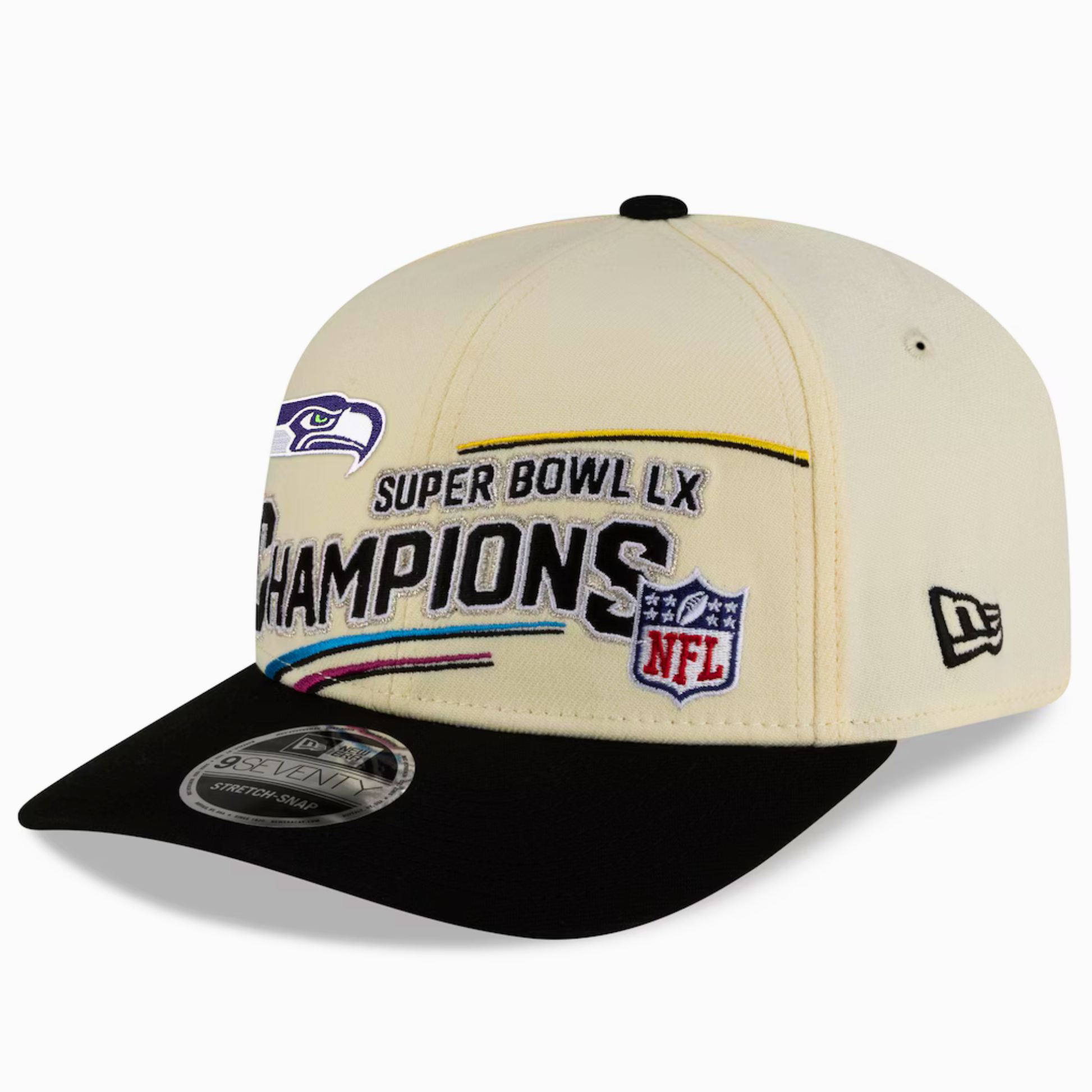 Celebrate the Seahawks' Super Bowl LX championship in style with this exclusive New Era 9SEVENTY adjustable hat. Featuring the iconic cream and black colorway from the official Locker Room Trophy Collection, this cap lets you rep your team's glory with authentic flair. The adjustable fit ensures comfort for every fan, while the premium construction delivers the quality New Era is known for. Perfect for game day or everyday wear, this commemorative hat is a must-have for any devoted Seahawks supporter.